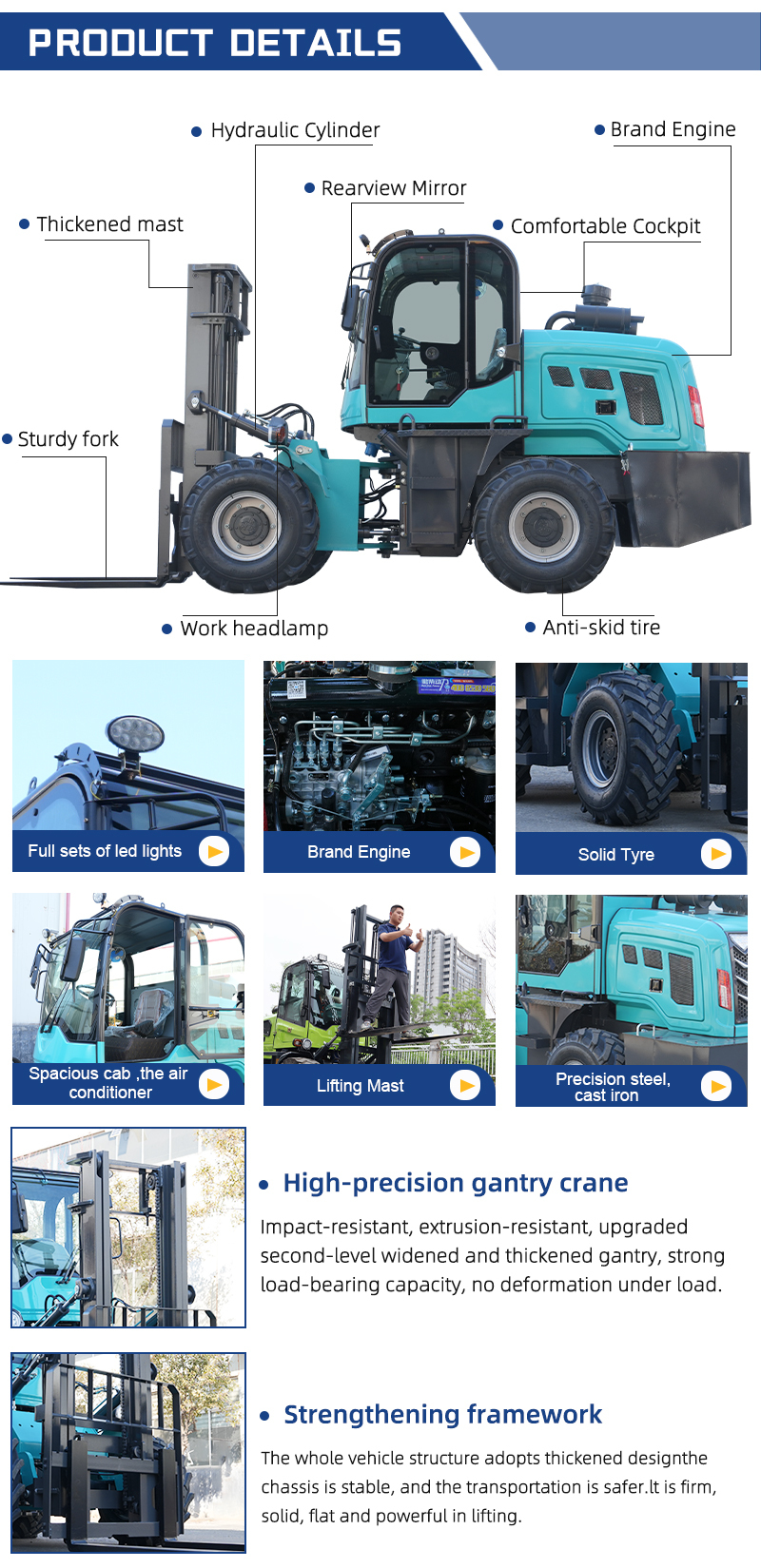 1.Comprehensive product line: The Sonca Group has successfully developed multiple series of forklift products, including 1-5 ton electric forklifts, 2-10 ton four-wheel drive off-road forklifts, and 2-10 ton two-wheel drive diesel forklifts.